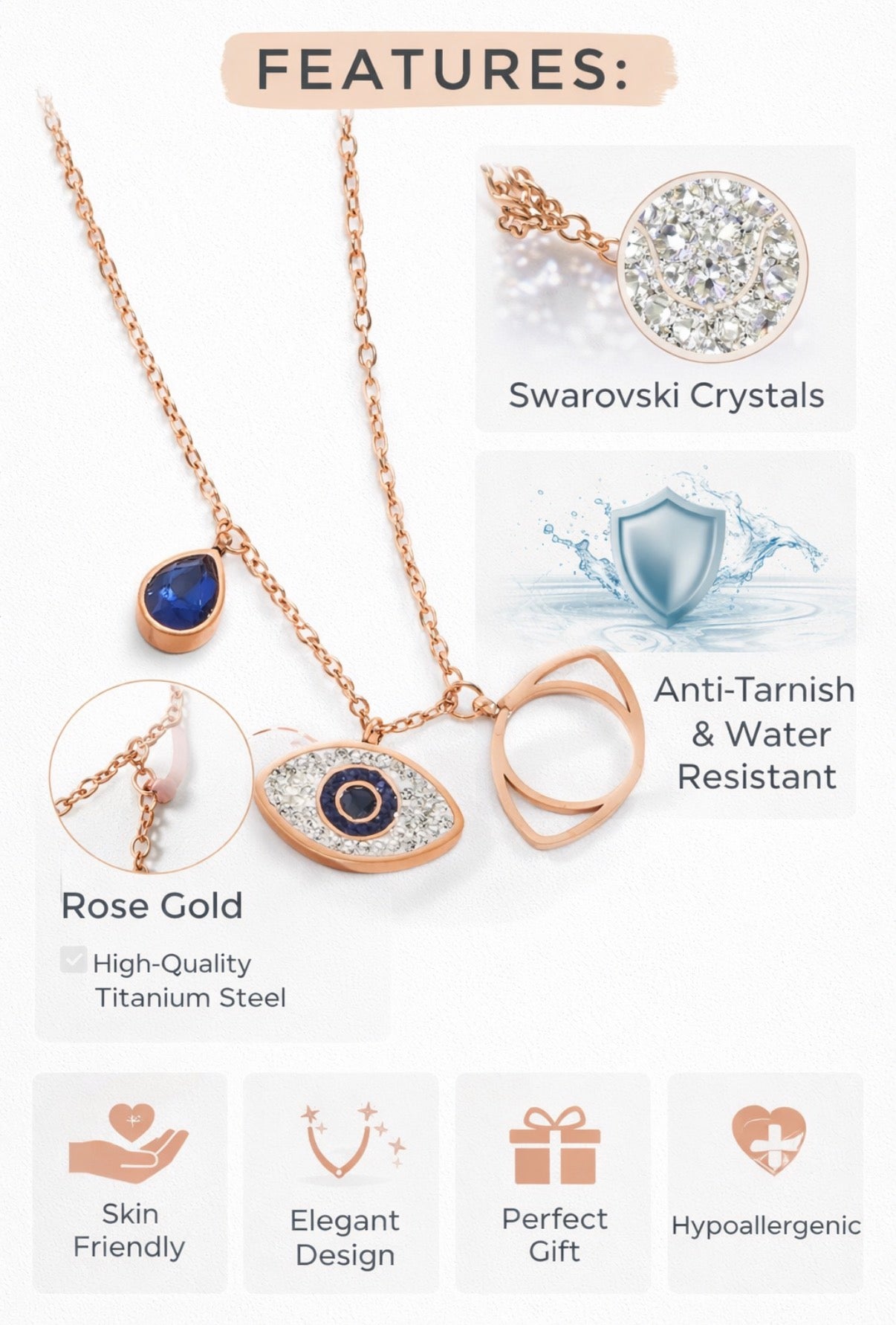 Add something extra chic to any layered necklace look thanks to this rose gold Evil Eye Layered Necklace. An evil eye charm is dotted with rhinestones along with another eye charm and minimal charms and features a blue stone. Whether with a little black dress or your sleekest separates, we just know you will reach for this piece again and again. It’s Anti Tarnish and Water Resistant.