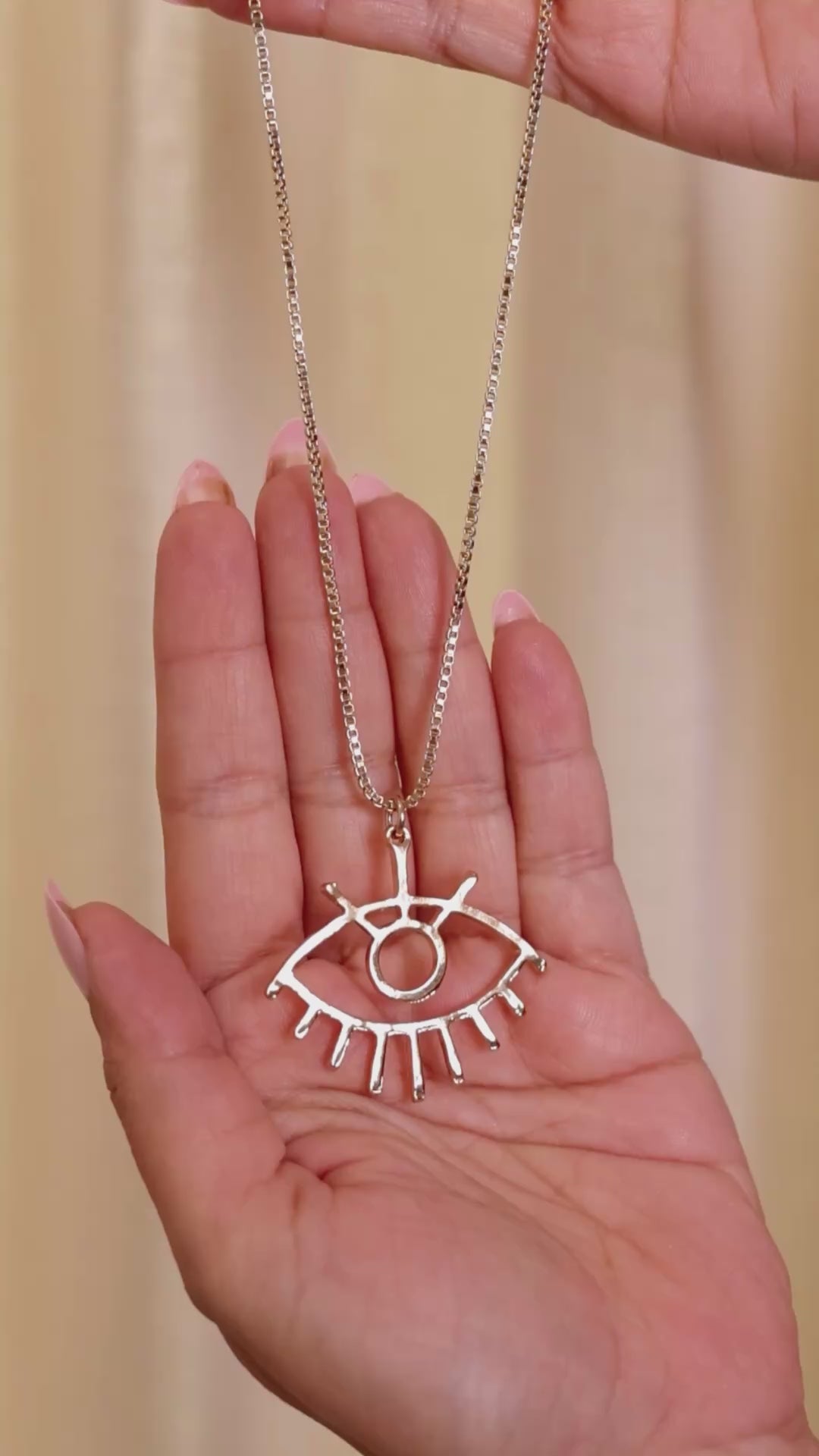 A striking necklace featuring a single large eye pendant symbolizing protection, intuition, and vision. Crafted with clean lines and a sleek finish, this piece effortlessly adds a touch of mystique and meaning to any outfit. Perfect for everyday wear or as a unique statement accessory.