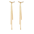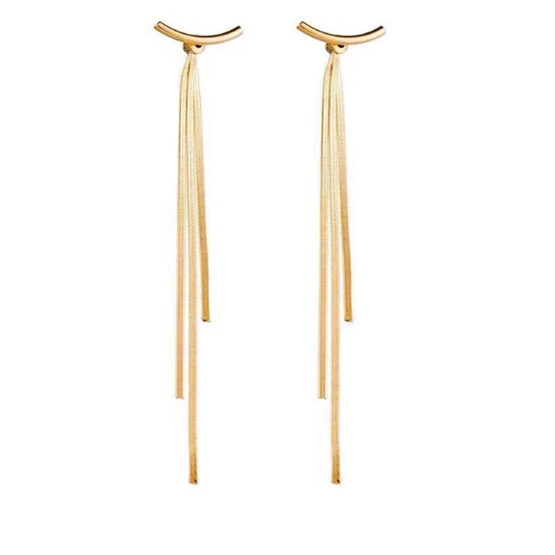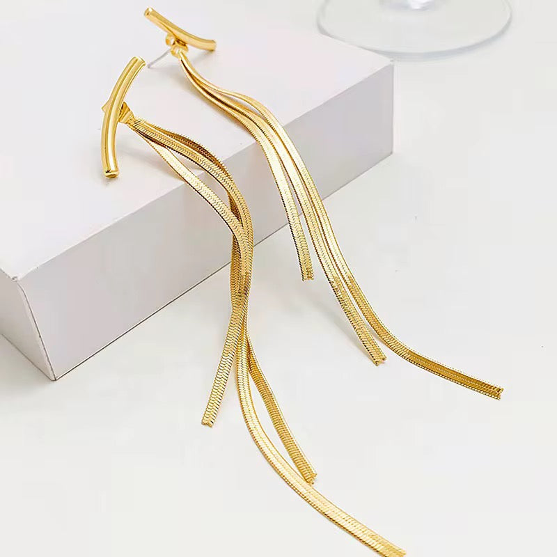 Turn heads with our long unique gold tassel snake chain earrings. In sleek gold-tone metal, this ultra-glam pair is an excellent take on the snake chain trend. These will immediately elevate everything from your favorite off shoulder or tube tops to a little black dress. Snakes are known for how they shed old skin, let us remind you of the magic of transformation.